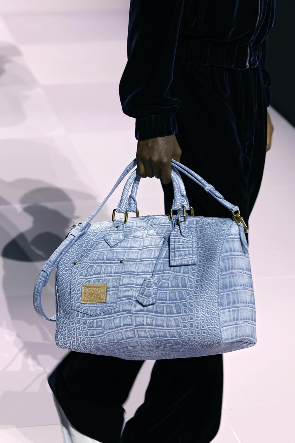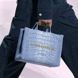 Francuska modna kuća Louis Vuitton je predstavlja maksi-tašne s dezenom zmijske kože u okviru muške kolekcije za jesen i zimu 2025/26, kao i kultnu torbicu Croissant PM, u svetloplavoj boji.