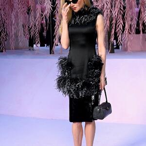 Isti detalj u vidu perja se pojavio i na bokovima formirajući voluminozni peplum koji je vizuelno naglasio struk i uneo dozu dramatičnostu i inače svedenu siluetu.