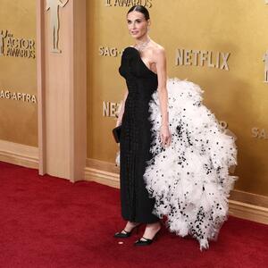 Umesto klasičnog šlepa, glumica je nosila raskošan ukras od volana od tila, beli komad prepun volumena koji krase crne tufnice. Tako je Demi postigla romantičan look i glamurozan stil koji podseća na tridesete godine prošlog veka.
