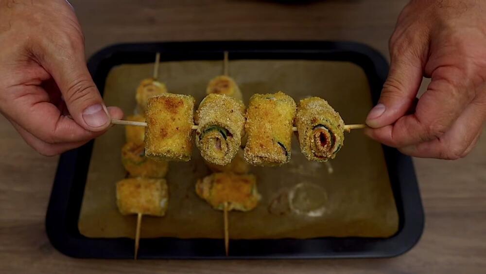 - Rolnice od tikvica sa svih strana uvaljajte u brašno, potom u jaja, pa u prezle. Tako pripremljene rolnice posložite na štapiće za ražnjiće, te stavite na pleh preko pek papira i ubacite na rernu na 200-220 stepeni da se peku oko 15 minuta.
